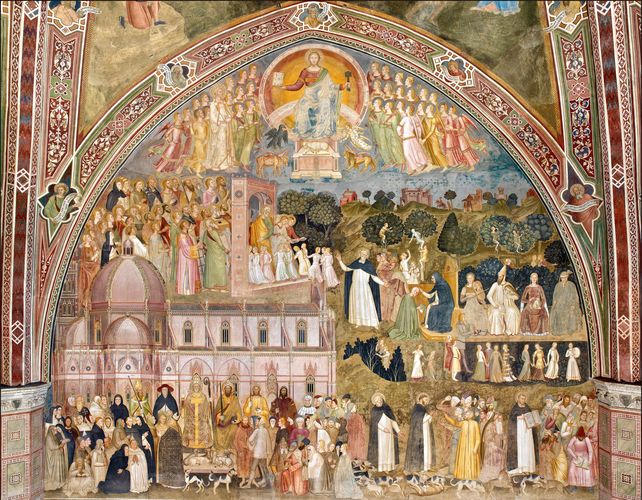 La Chapelle des Espagnols est l'ancienne salle capitulaire du monastère. Et tient son nom du fait de la fréquentation du lieu par Eléonore de Tolède, épouse de Cosme 1er de Toscane, au 16è siècle. Située du côté nord du cloitre vert, cette chapelle fut construite par Talenti vers 1343, et deux années durant. Sa décoration interviendra entre 1365 et 1367 grâce aux bons soins d'Andrea di Bonaiuto, alias Andrea de Florence, et de ses assistants. Ainsi la grande fresque figurant sur le mur droit met-elle en scène l'allégorie de l'Eglise triomphante (ci-dessous) et de l'ordre dominicain. Le réfectoire de l'endroit offre également d'admirer de nombreux objets religieux.