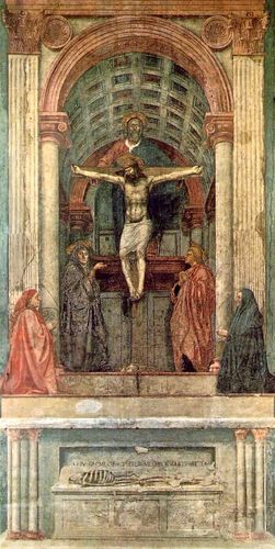 L'église doit sa renommée aux fabuleuses fresques qu'elle possède, parmi lesquelles celles de Giotto, Brunelleschi, Lorenzo Ghiberti, Benedetto da Maiano, Masaccio, Domenico Ghirlandaio (pour sa fresque de la chapelle Tornabuoni), Filippino Lippi et Andrea Castagno (pour son retable de la chapelle Strozzi). Au passage, j'admirerai « La Nativité », fresque de Sandro Botticelli, figurant sur le tympan interne de la façade, puis « L'Annonciation », dernière œuvre de Santi di Tito, sur le portail de gauche. Ce même artiste orna également le premier autel de la nef gauche avec son œuvre « Resurrezione di Lazzaro » qui prend la forme d'un retable. Le deuxième autel offre quant à lui « la Samaritana al pozzo », œuvre d'Alessandro Allori. Toujours dans la nef gauche, et sous la troisième travée, se trouve « La Trinité » de Masaccio (en photo ci-dessous), d'abord cachée, puis recouverte, puis déplacée et enfin remise à sa place initiale après sa redécouverte et sa restauration. Sous la quatrième travée, figure « la Resurrezione e quattro santi » de Giorgio Vasari, tandis que le cinquième retable montre la « Storie di Santa Caterina » (de Bernardino Poccetti).