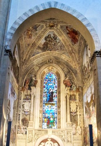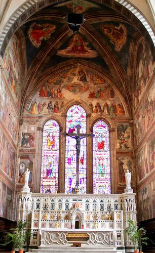 Arrêtons-nous quelques instants devant la Chapelle Tornabuoni (troisième photo ci-dessus), qui se trouve au centre et au fond de l'église, derrière le maitre-autel. Elle comporte un crucifix de Jean de Bologne, tandis que le choeur conserve un cycle de fresque de Domenico Ghirlandaio. La voûte offre pour sa part, et dans quatre compartiments, les « Evangélistes » avec leurs attributs traditionnels. Sur les parois, on peut admirer plusieurs scènes touchant entre autres à la Nativité de Marie (à gauche) ou à la Visitation (sur la droite).