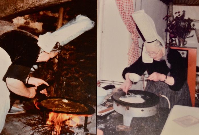 Il n'y a pas si longtemps, les repas étaient encore pris en commun, une habitude qui s'est perdue, malgré le fait que que la crêpe, elle, rassemble toujours les convives. Celle-ci ne se conçoit d'ailleurs que dans le partage. Certes, il y a la crêpe sous vide (industrielle) qui permet à tout un chacun d'en manger vite et seul, mais la véritable crêpe, celle qui est faite maison, rassemble tous les membres de la famille dans la plus large convivialité. Ce repas se prend autour d'une table, et dure plus ou moins longtemps selon le nombre de convives. Autrefois tenue à l'écart, pliée en deux dans la cheminée au-dessus du feu, la « crêpière » elle aussi se retrouve aujourd'hui parmi les convives et autour de la même table pour un plaisir partagé. Et c'est spontanément que les anciens ont répondu présent lorsque le Musée Bigouden a entrepris une collecte de témoignages dans les maisons de retraite du Pays bigouden. Les conversations s'animaient alors, entremêlées de doux souvenirs et de cet attachement profond pour la crêpe. Comme un petit goût de bonheur...