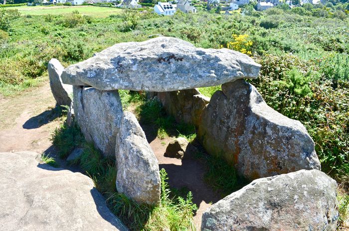 Marie et moi ne nous trouvons désormais qu'à quelques encablures de Portsall, dont nous allons découvrir l'allée couverte du Guilligui (première photo ci-dessous). Outre le dolmen, c'est surtout le site surmonté d'une croix surplombant le port qui offre une superbe vue sur la côte. Cette croix provient du cimetière de Saint-Usven aujourd'hui disparu, dont la chapelle dominait autrefois l'anse de Kersaint. Le mégalithe à entrée latérale daterait de 6000 ans avant J.C et est l'un des plus anciens en Bretagne.