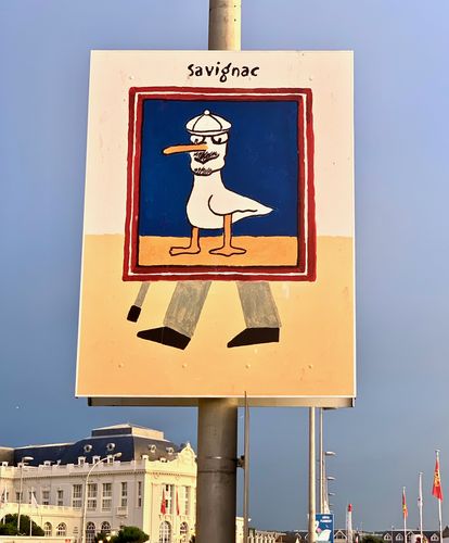 Après avoir un temps battu le pavé de la station balnéaire, Soraya et moi ne pouvions pas déroger à la traditionnelle balade sur les planches de Trouville-sur-Mer : cette promenade des planches sera rebaptisée « Promenade Savignac» en septembre 2001, en présence de l'artiste et en hommage à son œuvre. Depuis cette date, ladite promenade expose les affiches trouvillaises réalisées par notre homme. Une bien belle initiative, et un joli témoignage de la ville envers cet artiste qui quitta ce monde en novembre 2002. Depuis, la « Reine des Plages » a décidé de faire de Trouville un véritable musée à ciel ouvert. « L'affiche est fille des rues » disait Raymond Savignac car c'est là qu'elle s'exprime le mieux.