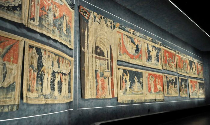 L'autre histoire heureuse est bel et bien l'idée qu'eut Louis 1er de commander une telle œuvre. Certes, notre homme est alors grand amateur d'oeuvres d'art, mais la tenture se révèle être une merveille artisanale réalisée en un temps record. Un chef d'oeuvre artistique et technique, tissé sans envers (son endroit et son envers étant tout aussi soignés, sans nœud ni fil apparent) et sur ...140 mètres de long. L'incroyable qualité technique de cette tapisserie sans envers atteste l'implication d'un atelier hautement qualifié et de très importants moyens financiers. Une œuvre si impressionnante qu'elle frappera les esprits, stimulera la rivalité entre les princes au point d'entrainer une politique de commandes de plus en plus ambitieuse, pour la plus grande joie des artistes. Toute aussi étonnante sera la conservation de la tenture au fil des siècles : objet de luxe ostentatoire, celle-ci deviendra le fleuron du trésor de la cathédrale angevine, en magnifiant notamment l'édifice lors des plus importantes fêtes religieuses. Le 18è siècle demeurera indifférent aux beautés dégagées par l'oeuvre qui sera démembrée, manquant alors de disparaître purement et simplement. Grâce au ciel, le chanoine Joubert entreprendra de sauver la tapisserie le siècle suivant, offrant ainsi l'occasion de perpétuer cette œuvre pour les futures générations. Je suis admiratif de l'immense labeur requis par une telle œuvre et des différentes étapes à franchir avant la consécration de la tenture : au départ, on trouve les commanditaires, puis les artistes, les cartonniers (et leurs croquis), la préparation de la laine, la teinturerie (à l'aide de plantes tinctoriales), la composition des tapisseries, le tissage en haute lisse et en basse lisse...