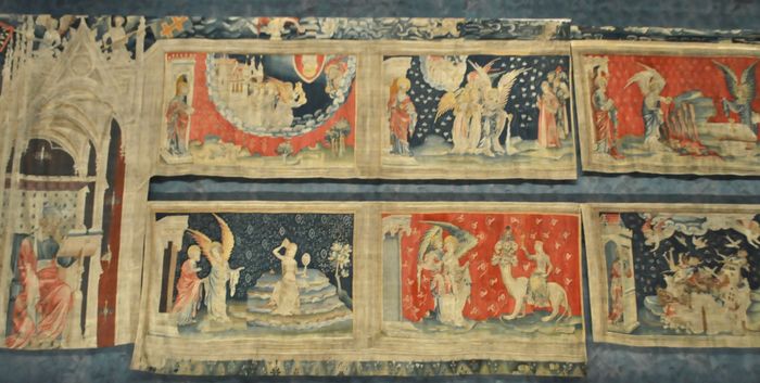 L'état de conservation actuel de cette tenture relève du miracle quand on sait que l'oeuvre a vécu une histoire mouvementée au fil des siècles. En effet, celle-ci sera tendue dans la cour de l'archevêché lors du mariage de Louis II (fils du commanditaire) avec Yolande d'Aragon en 1400, avant d'être cédée à la cathédrale d'Angers en 1480 par le roi René, dernier duc d'Anjou. Le 18è siècle la jugeant trop démodée, la tapisserie subira de graves mutilations avant d'être heureusement restaurée au milieu du 19è siècle, puis de revenir au château en 1954.