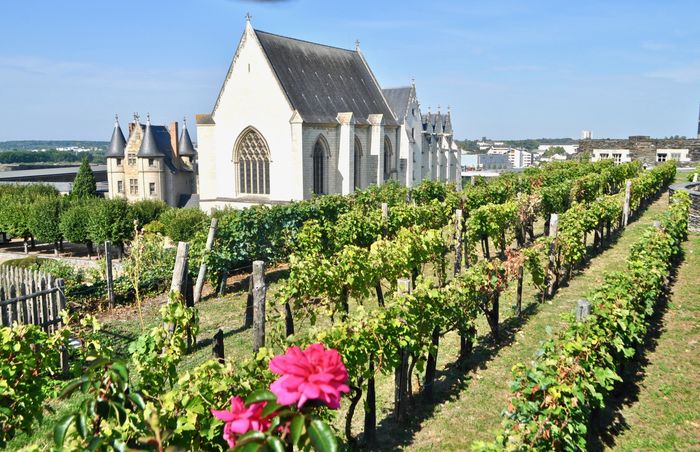Les remparts abritent même un jardin suspendu (formé de plates-bandes de formes géométriques) le refuge d'espèces médicinales, aromatiques, condimentaires, tinctoriales, maléfiques et mélifères. Des plantes dont la plupart était connue au Moyen-Âge et dont certaines d'entre elles sont représentées sur la tenture de l'Apocalypse. Au passage, j'aperçois une parcelle de vignes et son cépage Chenin (raisin blanc). Un peu plus loin, se trouve aussi un jardin de genêts et une roseraie tandis que le Logis royal possède lui aussi son jardin planté de plusieurs espèces et variétés d'Hydrangea, dont l'Hydrangea Macrophylla, hortensia originaire du Japon. Notre visite s'achèvera avec le jardin régulier, composé d'ifs, pelouses et buis situé dans la cour principale.