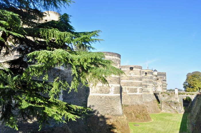 Se garer autour du Château n'est pas aisé mais Odile trouve une place de stationnement sans difficulté. Je suis immédiatement impressionné par la taille des fortifications qui se dressent devant moi : la forteresse est édifiée sur un promontoire rocheux dominant la Maine, site occupé depuis l'Antiquité compte tenu de sa position stratégique. Gaulois et Romains occuperont la place, suivis plus tard par les comtes d'Anjou (jusqu'à la fin de l'empire Plantagenêt). C'est Louis IX qui entreprend de bâtir le château actuel au 13è siècle, un château que les ducs d'Anjou occuperont par intermittence les siècles suivants. L'endroit, qui verra naitre René d'Anjou, sera (très) partiellement détruit sur ordre du roi Henri III lors des guerres de religion. Puis abritera successivement une prison (Fouquet, arrêté à Nantes par d'Artagnan, y sera détenu en 1661), une garnison militaire et un dépôt de munitions lors de la Seconde guerre mondiale.