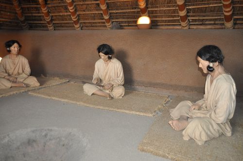 Nous faisons un bond dans le temps et remontons jusqu'à la période Yayoi, période qui s'étend sur 600 ans au cours de laquelle de nouveaux migrants arrivés au Japon correspondent à l'aboutissement du néolithique dans l'archipel. La population augmente, la société devient plus complexe. La population vit dans des villages de fermiers, tisse des draps, cultive le riz ainsi que d'autres céréales. Des objets et des outils en fer sont fabriqués. On stocke les grains. Les hommes accumulent les richesses et possèdent des bijoux faits de jade, ou de bronze ( objets cérémoniels).