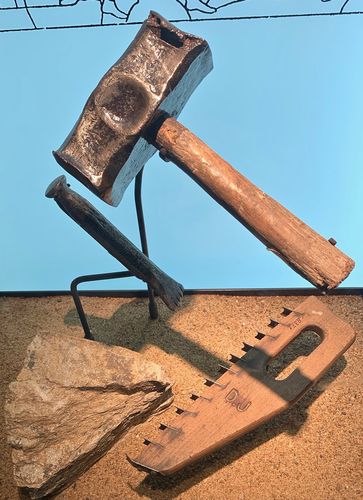 Chaque compagnon bâtisseur disposait d'outils appropriés pour exercer son art : pince, marteau, compas, équerre, règle, cordeau, niveau et moles... Et chaque ouvrier disposait aussi d'engins de levage pour soulever bois et pierres. Les plus puissants étaient composés d'une grande roue en « cage d'écureuil » mue par des hommes se déplaçant à l'intérieur de celle-ci. J'apprendrai enfin qu'une cathédrale était construite par étapes, en préservant par exemple l'ancienne église (qui servait ainsi aux offices) et en érigeant à côté les premiers éléments du nouvel édifice religieux destiné à remplacer l'ancien. Le traçage d'une cathédrale n'excluait pas essais et adaptations permanentes en cours de chantier et l'une des principales qualités d'un maitre d'oeuvre était justement l'adaptabilité. Ces différents métiers et outils mirent ainsi des années durant leurs talents au service de cette grande aventure qu'était le chantier cathédrale, un chantier qui pouvait compter jusqu'à 300 personnes. Les différentes salles du centre permettent de découvrir des maquettes de la cathédrale, des mises en situation d'engins de levage et des mises en scène d'outils anciens.