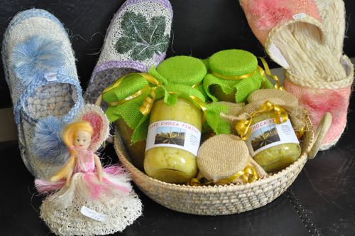 De jolies poupées en choca, des savates en choca (25 à 30 €), des achards de choca avec ou sans piment ( sorte de confiture à tartiner sur des toasts) de 3 à 4 € le pot, des confitures faites au feu de bois ( gingembre, litchi...) à 5/6€ le pot.