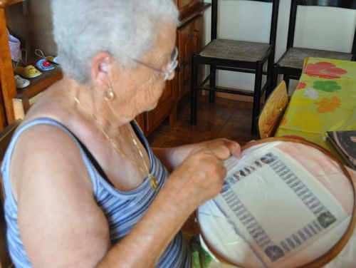 Nous terminons notre visite et je prends congé de Monsieur Bénard, un personnage hors du commun. Puis je rends visite à Madame Payet, l'une des brodeuses de l'Entre Deux. Elle brode à l'aide du choca, cette fibre tirée d'un agave présent sur l'île. Cet agave est à la fois utilisé pour ses fibres et pour son coeur. Ses fibres servent à la fabrication d'objets, et son coeur tendre entre dans la fabrication d'achards plus ou moins agrémentés de piments.