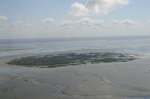 Nous apercevons à côté des cabanes tchanquées l'île aux oiseaux. Elle serait soit un ancien banc de sable, soit les restes d'une haute dune. Sa superficie varie en fonction de la marée ( de 300 à...3000 hectares). On y parquait autrefois vaches et chevaux jusqu'à ce qu'une forte tempête n'engloutisse les troupeaux en 1714 et en 1882. Elle devint alors un terrain de chasse et de pêche mais aussi un lieu de refuge important pour les oiseaux migrateurs. Des excursions sont régulièrement organisées vers ce site classé , lieu de rendez-vous des plaisanciers. On trouve même sur place un puits d'eau douce artésien.