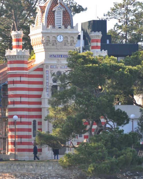 On aperçoit aussi, sur le commune de l'Herbe l'endroit où fut autrefois érigée la Villa Algérienne ( photo ci-dessous). D'inspiration mauresque, cette vaste construction fut bâtie en 1865 par Léon Lescat, un français qui avait fait fortune en Algérie en construisant notamment le port d'Alger. Un magnifique parc de 25 hectares entourait la maison qui fut laissée à l'abandon à la mort de son propriétaire en 1913. Démolie en 1965, elle laissa place à une construction moderne sans attraits. La photo montre la Chapelle de la Villa Algérienne qui est actuellement restaurée. Construite après la villa, et réservée à l'époque au seul usage de la famille Lescat, cette chapelle de L'Herbe offre également un style mauresque. A son sommet, on peut observer l'union de la croix et du croissant. Cette chapelle a survécu depuis à l'histoire. Léon Lescat avait à l'époque introduit la culture de la vigne et l'exploitation rigoureuse de la forêt, et même celle du mimosa qui orne si magnifiquement les jardins de nos jours.
