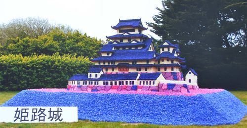 En ce printemps , j'ai trouvé mon bonheur côté fleurs. A Plomeur, Mr Kaandorp ( ce monsieur ne serait-il pas hollandais?) a eu la bonne idée de cultiver hyacinthes et tulipes dans les champs avoisinants. Les automobilistes sont nombreux à s'arrêter le long de la route pour photographier les plantes à bulbe. Je ne déroge pas à la tradition , puis me rends ensuite à la fête des fleurs. Et , oh surprise, je découvre....le château japonais Himeji-Jo reconstitué en fleurs bleues. Incroyable. Ce sont mes lecteurs japonais qui vont être contents. D'autant plus qu'une promenade en train est possible, grâce à une locomotive qui ressemble comme deux gouttes d'eau à... une faïence Henriot!