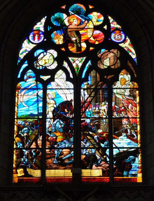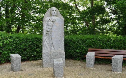 Il y a bien une église dans cette cité? Oui, oui, me répond un habitant, il s'agit de l'église Saint Jacques. A cinq minutes en voiture, j'aperçois en effet l'édifice religieux, jouxtant le Prieuré du même nom. Juste à côté, le long de la route en direction de Louvigné du Désert, se trouve une stèle. Celle de Guillaume le Conquérant. Celle-ci a été érigée exactement à l'endroit où se trouvait le Château du fameux homme, château qui fut démoli en 1590 et qui servit de refuge à Montgoméry, seigneur de Ducey (ville toute proche). Autour de la stèle se trouvent cinq bornes en pierre nominatives qui représentent les cinq chevaliers du canton qui accompagnèrent Guillaume le Conquérant dans sa conquête de l'Angleterre , en 1066.