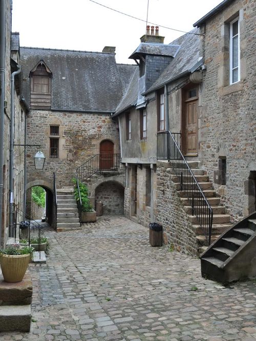Je remarque de toutes petites rues, appelées cours, notamment dans la rue du Docteur Havard. Il faut se souvenir que Villedieu-les-Poêles vivait beaucoup de l'artisanat. Et ces cours étaient les ateliers où se rassemblaient les artisans qui travaillaient entre autre le cuivre. Dans chaque cour vivaient plusieurs familles. Au rez-de-chaussée se tenaient les batteries (ateliers où l'on battait les plaques de cuivre pour les transformer) et à l'étage les habitations. Les lucarnes dotées de potence qui se trouvaient sur les toits étaient utilisées pour acheminer le bois. En 1742, on dénombrait 139 batteries. Depuis, les cours ont retrouvé le silence et la tranquillité de lieux de villégiature mais il n'en fut pas toujours ainsi. On dénombre ainsi de nombreuses cours à Villedieu (Cours de l'Enfer, du Paradis, de la Luzerne ou des Hauts-Bois....), cours qui étaient autrefois toujours fermées la nuit. Les habitants en étaient propriétaires et il y régnait souvent un esprit de clan. Tout le monde prêtait main forte lorsqu'une corvée (arrivée d'une charretée de bois ou de cidre) se présentait. Au moment des communions, une communiante fortunée prenait en charge une communiante qui ne l'était pas. La solidarité était forte.