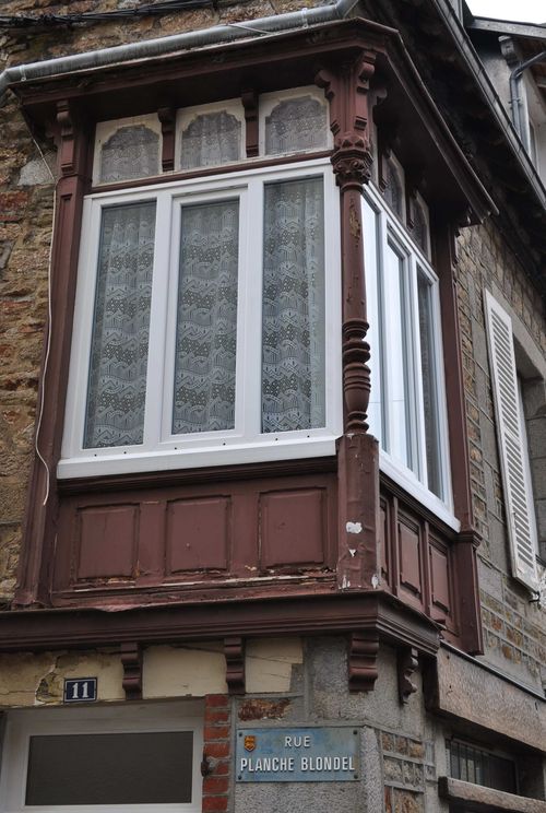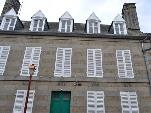 Je me promène dans la rue Gambetta, située à proximité de la Commanderie. Et y retrouve de grandes maisons bourgeoises en granit du Gast et en pierre de la Butte Pagnier qui datent des XVIII ème et XIX ème siècles. Au numéro 22 (photo ci-dessous), la maison est représentative de Villedieu-les-Poêles avec ses persiennes claires typiques, sa cheminée massive en granit et ses lucarnes. Juste à côté, au numéro 20, on peut admirer un bel exemple de construction utilisant la pierre de la Butte Pagnier.