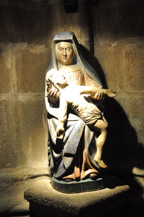 La renommée de cette église est assurée par les magnifiques statues: Sainte Vénice , une sainte guérisseuse invoquée pour les maux des femmes, mais aussi une drôle de statue en pierre qui représente Notre Dame de Pitié portant dans ses bras le Christ adulte(photo ci-dessous). D'autres statues, en bois polychrome, sont protégées par les Monuments Historiques et personnifient les patrons des anciennes confréries. On retrouve ainsi dans l'ancienne Chapelle Saint Jean la statue de Sainte Anne mère de Sainte Marie et patronne des poêliers. Puis à droite Saint Nicolas, le patron des marchands de salaison que l'on reconnait par son saloir d'où sortent trois enfants, puis Soeur Emerentienne, la mère de Sainte Anne et la patronne des dentellières et des fileuses. L'église abrite également Sainte Barbe la patronne des fondeurs de cloches et des sapeurs pompiers. Dans le transept nord se trouve la liste des gardes de la confrérie des chaudronniers et des dinandiers dont Saint Hubert est le patron.