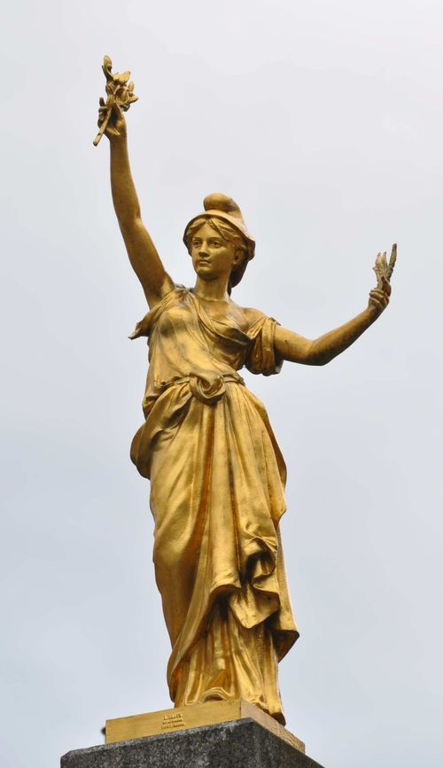 Je remonte par la Place de la République, très animée les jours de marché ( le mardi). Le stationnement y est alors interdit. La cité a su préserver une certaine activité commerciale au fil des siècles. En 1710, on y comptait 108 boutiques de commerces divers situés le long de la rue Gambetta et le long des Halles ( l'actuelle Place de la République).J'observe avec attention , en haut de la Place, la statue de la République érigée sur sa colonne en 1899, qui rappelle l'engagement républicains des sourdins qui dès les premières heures de la Révolution française soutinrent la République alors que les troupes royalistes de Monsieur de la Rochejacquelin pillaient la cité. On retrouve dans cette statue tous les symboles de la République: Le laurier, le blé et le bonnet phrygien.