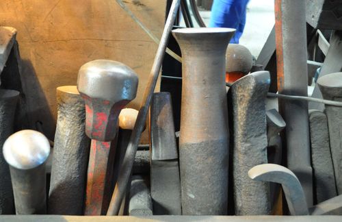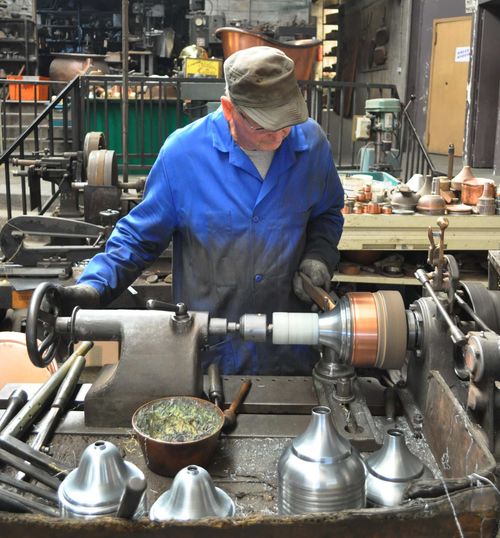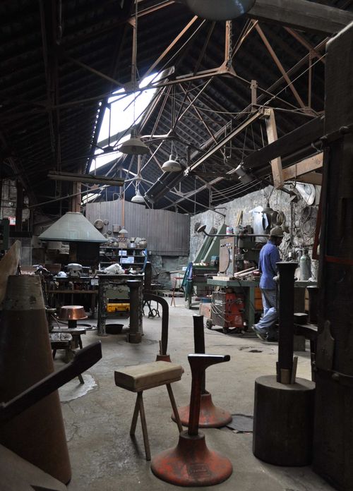 On ne trouve pas de gisements de cuivre à Villedieu-les-Poêles. Ne cherchez pas! Les plus proches se trouvent en Espagne. Ou encore aux Etats Unis, en Russie ou en Afrique du sud. C'est au XII ème siècle qu'Henri 1er Beauclerc accueillit les poêliers. Et les dinandiers. Mais qu'est-ce que la dinanderie? Sous ce nom, on rassemble sous ce nom la technique qui consiste à mettre en forme le cuivre, l'argent, le laiton ou l'étain, pour en faire des objets et ustensiles. La transformation se fait principalement au marteau. A l'origine, ce travail était effectué dans la ville de Dinant (Belgique) d'où le nom de dinandier. Et puis l'activité se répandit en France , à Villedieu et à Durfort. Afin de se procurer le cuivre nécessaire à la fabrication d'objets, des colporteurs parcouraient le pays afin de récupérer des ustensiles usagés , lesquels étaient ensuite brisés puis refondus par des femmes. Il n'y a aucune perte dans cette industrie car même les découpes sont refondues et réutilisées , m'explique un ouvrier de l'atelier. Différentes étapes sont donc nécessaires avant d'aboutir au produit final: Fonte du cuivre puis transformation en lingot, laminage pour le transformer en feuille, puis découpage, emboutissage et repoussage, martelage,étamage, polissage...autant de savoirs faire indispensables à la réalisation de tous ces objets. On cuit et on recuit le cuivre si nécessaire. On utilise également des outils appelés « tas » pour donner la forme au cuivre ( ne dit-on pas « apprendre le métier sur le tas »?). L'atelier du Cuivre est en plus dépositaire d'un système unique de rivetage de queues d'ustensiles sans rivets apparents, ce qui garantit une plus grande solidité et une meilleur hygiène d'utilisation.