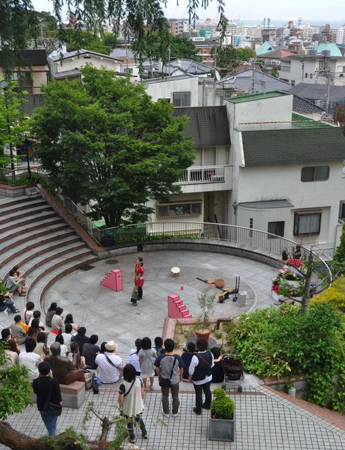 Plus grande ville située dans la préfecture de Hyogo, Kobé comptait 1,5 million d'habitants en 2010. Kobé est avant tout connu pour son bœuf de renom. Et pour son quartier européen. Je découvre par hasard que cette ville est (entre autre) jumelée avec Marseille depuis 1961. Ses contreforts me font étrangement penser à Montmartre par endroits. Lorsque j'atteins le quartier Kitano, des jardins en espaliers me rappellent les vignes plantées à flanc de coteaux dans le quartier parisien. Une ambiance similaire se dégage d'ailleurs des lieux. Beaucoup de Japonais se promènent dans ces rues pleines de charme. Attiré par des applaudissements, je tombe sur une place: la Kitano no Plaza (Place de Kitano) , endroit circulaire accroché à la colline où se produit une jaune artiste nippone avec son singe qui exécute des figures acrobatiques (regardez la vidéo dans la section médiathèque). Plusieurs dizaines de spectateurs, japonais pour la plupart ,jouissent de ce spectacle gratuit. A l'entrée de cette place est fixée une place symbolisant le « quartier de l'amitié ».