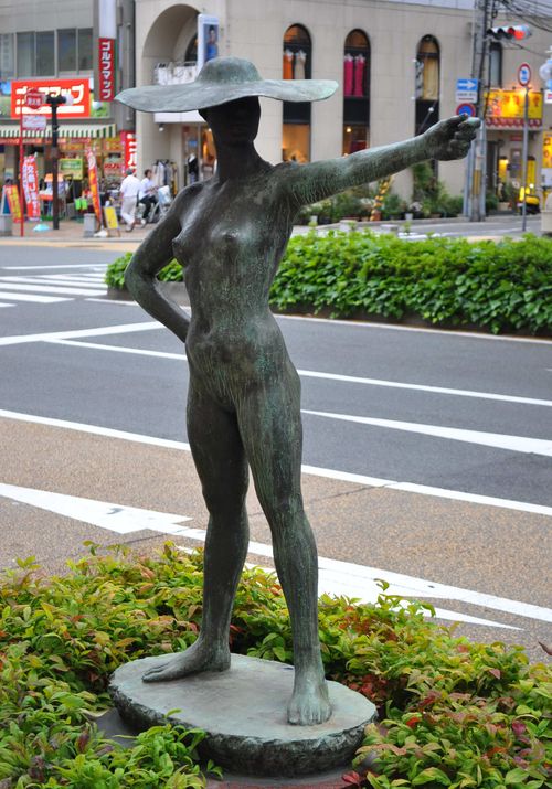 Kobé est une ville très active, située entre mer et montagne. J'aperçois déjà sur les hauteurs les nuages qui enveloppent les sommets. Pourvu qu'il ne pleuve pas! Je suis arrivé de Paris il y a seulement quelques heures et je me sens un peu vaporeux. La pluie ne ferait que gâcher un peu plus mon séjour, mais on ne choisit pas le temps qu'il fait. Dans la rue, je remarque ici et là quelques statues de femmes nues, une idée originale qui je l'espère ne distrait pas trop les conducteurs (photo ci-dessous). L'une d'entre elle semble régler la circulation.