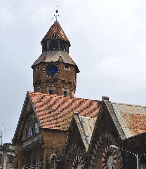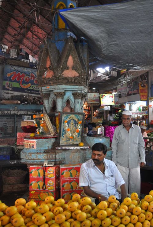 Quelques instants plus tard, mon chauffeur me dépose à proximité du Crawford Market. Ce marché a depuis été rebaptisé Mahatma Jyotiba Phule Market et est l'un des endroits les plus fascinants de Bombay. Il s'étend au nord de la gare ferroviaire que je viens de visiter et a été conçu par William Emerson. Il s'agit là d'une construction assez surprenante coiffée d'un clocher (photo ci-dessous) et ornée d'arches mauresques et de pignons à colombage. Celle-ci date de 1889. Une vaste halle centrale est dotée de deux ailes. On y trouve fleurs, fruits et légumes, poissons et oiseaux exotiques. Ce sont environ 3000 tonnes de produits frais qui sont vendues chaque jour dans ce marché. Le sol, pavé en pierre de Caithness (Ecosse) reste frais toute la journée.