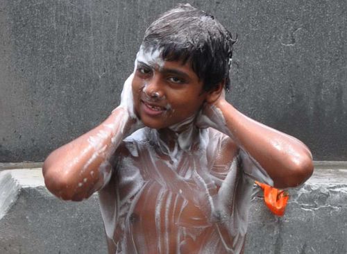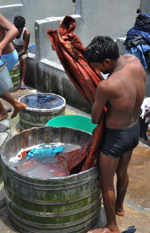 Encore un chemin à franchir et j'aperçois deux hommes qui ramassent du linge sec au milieu de dizaines de rangées de vêtements en train de sécher à l'air libre. On compte une dizaine de laveries de ce type à Bombay : plusieurs ouvriers ( dont quelques enfants) s'affairent au lavage du linge qui leur a été confié. Je suis autorisé à filmer cette scène étonnante qui a depuis longtemps disparue dans nos contrées. Autour d'un puits se trouvent plusieurs baquets qui servent au lavage, puis au rinçage du linge. Sur les côtés, d'autres bacs en ciment contiennent de l'eau. Plus loin, ce sont des baignoires posées ici et là, qui servent à laisser tremper certaines pièces. Et au fond, que vois-je? Une essoreuse à manivelle comme on n'en fait plus. Le système ingénieux permet toujours aujourd'hui d'essorer plus rapidement les pièces de linge avant de les étendre sur les cordages. Un gamin fait sa toilette dans un coin , au milieu des ouvriers. Le tout dans la plus grande simplicité. Scène authentique et spontanée. Je remercie l'assistance pour son chaleureux accueil et m'efface, les laissant poursuivre leur dur labeur.