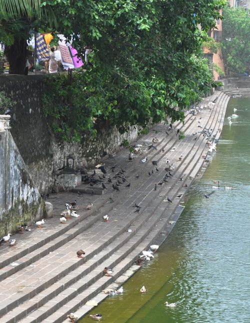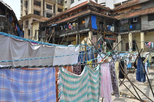 Rajesh ( c'est le nom de mon chauffeur) m'invite maintenant à découvrir une laverie. N'ayant pas d'à priori et partant du principe que tout peut être intéressant, j'acquiesce et nous voilà partis de l'autre côté de la baie de la Mer d'Oman. Jusqu'ici, nous nous trouvions dans la partie sud de Bombay, appelée Colaba. Nous longeons la côte. Il y a beaucoup de vent ce matin et la marée haute fait déferler les vagues par-dessus la jetée à certains endroits. Heureusement, il fait beau temps. Nous nous dirigeons en direction des jardins suspendus (Hanging Gardens) que nous visiterons à notre retour. Des quartiers (relativement résidentiels), nous passons désormais aux quartiers plus populaires, remplis d'échoppes diverses, autant de lieux grouillants de vie. Nous nous garons et nous marchons durant quelques instants, passons à proximité de quelques temples donnant tous sur un plan d'eau (voir photo ci-dessous). Du linge sèche au loin. C'est bon signe. Un taxi , lui aussi, s 'apprête à livrer sa cargaison (photo). Nous ne sommes plus loin de l'endroit.