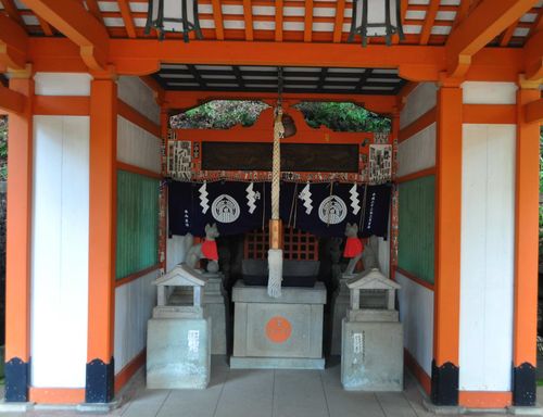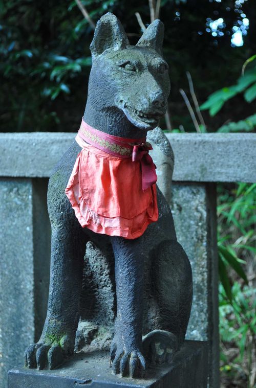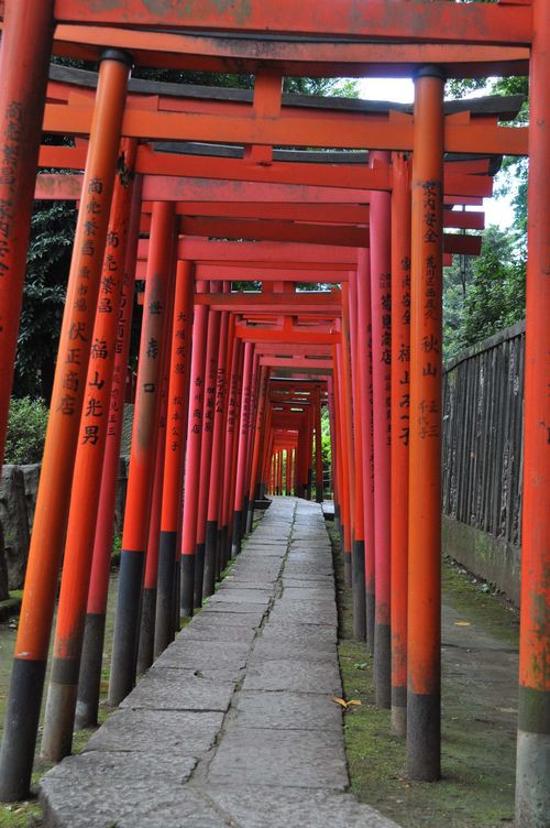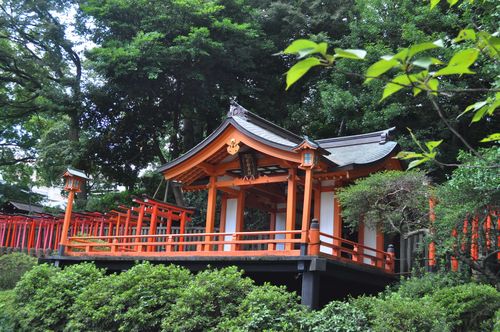 Le sanctuaire shintoiste de Nezu fut construit en 1705, et le meilleur moment pour le visiter est sans aucun doute durant le Festival des Azalées (Tsutsuji matsuri) qui a lieu du début avril au début du mois de mai. Les jardins du sanctuaire sont alors plus fleuris que jamais: Les massifs variés offrent leurs plus belles fleurs de la fin avril au début mai, alors que les pruniers ont offert leurs fleurs dès février. On dit que le sanctuaire fut fondé par le moine légendaire « Yamato Takeru no mikoto ».Mais on doit la structure actuelle des lieux au 5ème Shogun Tsunayosi Tokugawa. Durant son règne, ce dernier s'affirmera en tant que défenseur du néo-confusianisme de Chu Hsi. Puis il se voudra le protecteur des chiens, probablement par superstition (car il était né durant l'année du chien dans le calendrier chinois). En 1687, il promulgua ainsi la loi « Shorui Awaremi no Rei », qui interdisait d'abattre les animaux et qui mettait en place un responsable de la protection animale. Et fera plus tard installer des mangeoires pour plus de 10000 chiens . Toutes ces lois firent qu'on lui attribua le surnom de « Shogun chien » (Inu kubo). Je comprends mieux maintenant ces statues habillées réparties ici et là dans le sanctuaire de Nezu et ayant l'apparence de chiens.