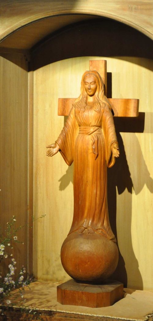 Rien donc d'étonnant à ce que la Vierge Marie débarque un jour sur l'archipel en pleurant toutes les larmes de son corps. Vous ne le saviez pas? Et pourtant. Il était une fois Soeur Sugawara. En 1946, à la fin du conflit mondial, une jeune femme vint s'installer sur quelques arpents de terre isolés sur la colline de Yuzawadai. Elle se prénommait Sumako Sugawara et sera plus tard la fondatrice de Seitai Hoshikai après s'être au préalable convertie à la foi catholique. La toute première chapelle prit forme dès 1953. Une petite communauté était en train de naitre dans le coin, qui vivait de la culture et une nurserie fut créée pour répondre aux besoins des gens sur place et le but de Soeur Sugawara prenait forme: Instaurer un mode de vie contemplatif, fait de travail et de prière. En 1963, il fut décidé par les trois soeurs désormais sur place (Kotake, Ikeda et Sugawara) de dédier l'endroit à la Vierge Marie de Yusawadai, et l'on dressa une statue taillée d'après l'image d'une photo de Notre Dame de toutes les Nations. Monsieur Saburo Wakasa en fut le sculpteur. Puis un couvent fut bâti. Mais un événement inattendu se produisit en mars 1973: L'une des soeurs de la congrégation devint soudainement sourde. On en déduisit que la soeur souffrait des conséquences d'une trop grande fatigue. En juillet de la même année, on découvrit au creux des mains de la soeur et de la Vierge la même blessure en forme de croix. Des bulles de sang sortaient de la main de la statue de la Vierge et la blessure de la soeur dura pendant trois mois. Et puis, les évènements se poursuivirent le 4 janvier 1975 , à Yusawadai ,lorsque la statue de la Vierge (photo ci-dessous) se mit à pleurer dans la chapelle. Les pleurs se poursuivirent plusieurs jours consécutifs. Et cet événement se reproduira une centaine de fois jusqu'au 15 septembre 1981. Les sécrétions lacrymales furent bien sûr envoyées aux universités d'Akita et de Gifu et les analyses conclurent qu'il s'agissait bien de larmes humaines. L'évêque demanda d'abord aux soeurs de garder le secret sur ce qui venait de se produire car la chose paraissait pour le moins mystérieuse. Des fuites se produisirent malgré tout, donnant naissance à de nombreux articles dans la presse. On prétendait que jusqu'à 500 témoins avaient vu la Vierge pleurer. En 1976, l'évêque Ito réclama à Tokyo la création d'une commission d'enquête. Mais la commission conclut qu'il n'y avait là rien de surnaturel. L'évêque persista, jusqu'à rencontrer des personnages à Rome qui purent l'aider. Rome informa le diocèse d'Akita le 22 avril 1984 que rien ne permettait de rejeter la thèse de l'évènement surnaturel, et qu'il était permis de vénérer Notre Dame d'Akita en attendant une réponse définitive du Vatican.
