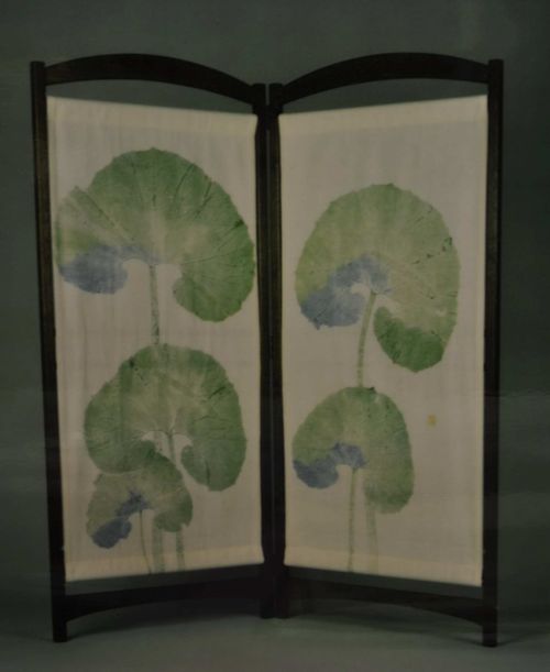 Un autre art s'est développé à Akita: Celui de reproduire à l'encre, sur des tissus mais aussi du papier ( pour constituer par exemple des paravents comme sur la photo ci-dessous) les motifs de la feuille de lotus, une plante locale. Au centre d'exposition, vous pourrez admirer des carrés de tissus représentant ce motif ainsi qu'un paravent qui garnira avantageusement votre intérieur.