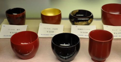 J'aperçois aussi de la vaisselle laquée, appelée Ikomanuri ou Kawatsura Shikki. Ikomnuri est un artisanat qui fut développé à Akita par des artisans arrivés lors de la Période Edo et qui utilisèrent la méthode Ryukyu ( venant de l'ancien Okinawa)pour laquer de noir et de rouge les objets (photo). Les objets Kawatsura-Shikki, eux sont originaires de la préfecture d'Akita. Il faut remonter en 1193, il y a 800 ans environ, pour trouver Michinori Onodera. Ce garçon est le frère de Shigemichi Onodera qui est alors le Lord du château de Inaniwa et un des vassaux de Yoritomo Minamoto. C'est à cette époque qu'on appliqua pour la première fois de la laque sur une armure. Puis sur des bols destinés à un usage quotidien. La laque franchit progressivement le stade industriel et l'on trouve de nos jours au Japon quantités d'objets laqués. On compte actuellement 174 ateliers pour 623 employés travaillant dans ce domaine.