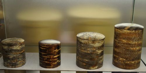 Je file maintenant découvrir les produits artisanaux. Les jolies boites en bois de cerisier (photo ci-dessous) appelées aussi Kaba-Zaiku , en font partie et elles ont une histoire. La voici: Cet artisanat est arrivé à Akita dans les années 1775-1783. Hikoroku Fujimura était un officier du Lord Satake. Il trouva ainsi le moyen d'occuper ses soldats en les faisant travailler le bois. Après qu'ils eurent perdu leur emploi suite aux réformes pendant la période Meiji, l'artisanat en bois de cerisier devint primordial pour eux. Ils se mirent à produire de nombreux produits dont ces boites, qu'ils vendirent progressivement dans tout le pays. Le produit s'est depuis perpétué. 104 ateliers pour un total de 305 artisans produisent ces articles selon une technique particulière qui permet de donner au bois de cerisier ce lustre et cette superbe couleur. On peut ainsi trouver des boites, des boites à thé, dohran, inro, des boites Kijimono, des boites pour ranger des documents (Fubako), des boites pour ranger les ustensiles nécessaires à la préparation du thé (Chadansu), des broches et des épingles à cravate.