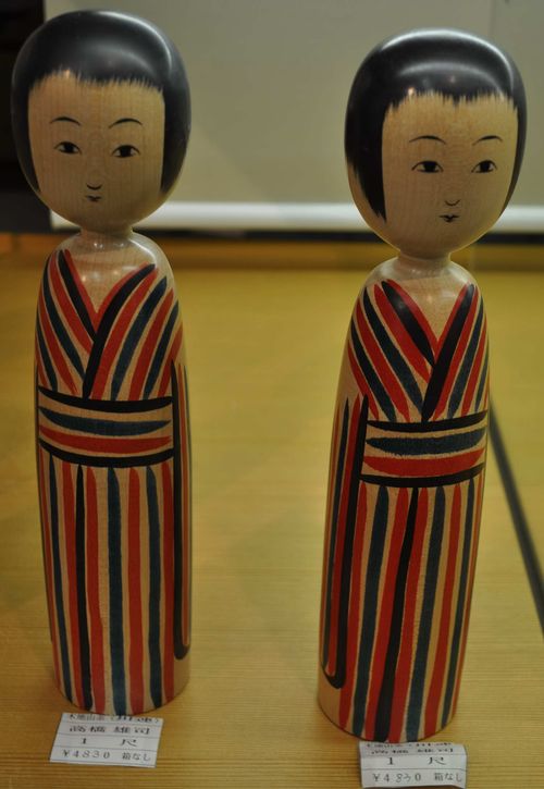 Et me voici maintenant au rayon des poupées avec ces poupées quilles en bois tourné (Kawatsura Kokeshi) faite dans la Préfecture d'Akita. On découvrit ces poupées pour la première sous l'ère Edo. Des artisans en bois laqué de la région de Kawatsura les avaient fabriqué pour leurs enfants en guise de jouets. Il y en a désormais de plusieurs tailles et c'est de nos jours l'un des produits phare d'Akita. Cinq ateliers produisent actuellement ces poupées.