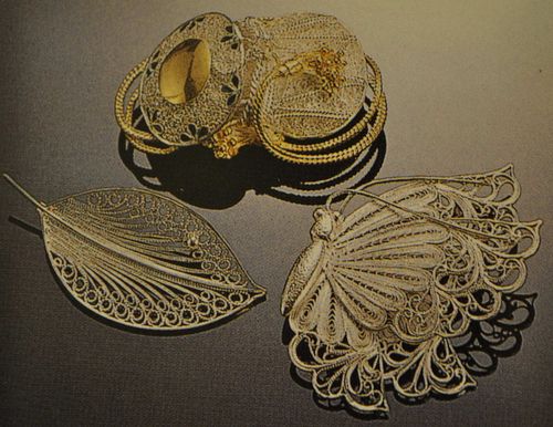 De jolis bijoux m'attendent dans une autre vitrine. Il s'agit de bijoux brodés au fil d'argent (Akita Ginsen Zaiku). Lorsque Yoshinobu Satake, Lord d'Akita, arriva dans la ville, en 1602, il amena avec lui des artisans talentueux dans le travail de l'or et de l'argent. On prétend que c'est de cette époque que datent cet art de confectionner les Ginsen Zaiku. Ces artisans furent nommés artisans décorateurs à partir de la période Edo et fabriquèrent de nombreux objets par plaquage et gravure d'or et d'argent . Les bijoux Ginsen Zaiku d'Akita prospérèrent au point de devenir l'une des activités les plus connues de la ville, no seulement au Japon, mais partout dans le monde. La technique est en apparence simple et consiste, à l'aide d'un fil d'argent de 0,2 millimètre de diamètre, à créer des motifs variés qui au final offriront l'image d'une broderie (photo ci-dessous). On réalise ainsi des broches, des épingles à cravate, des épingles pour kimonos, des boites à bijoux et des cadres photos. Cet artisanat fait vivre aujourd'hui une vingtaine d'employés répartis dans 9 ateliers.