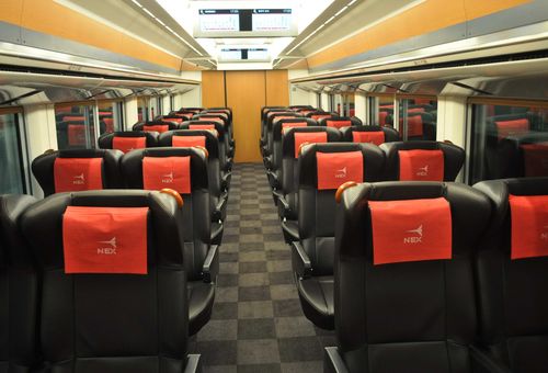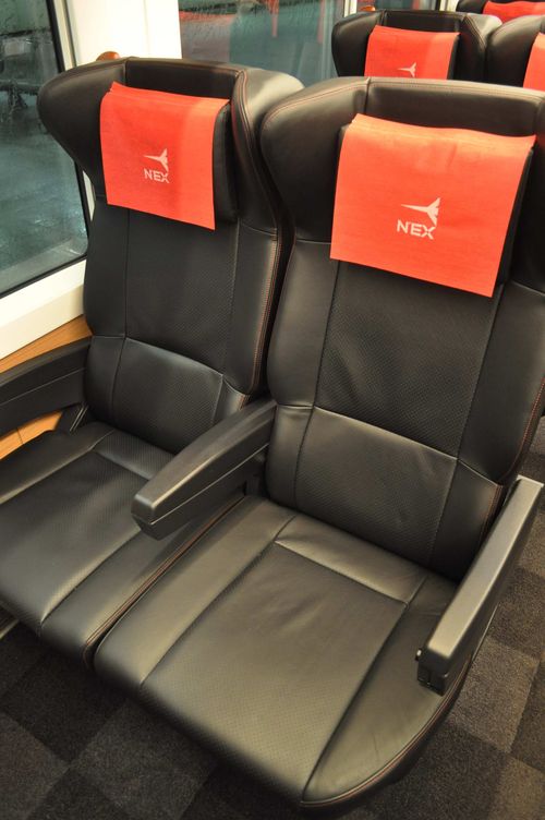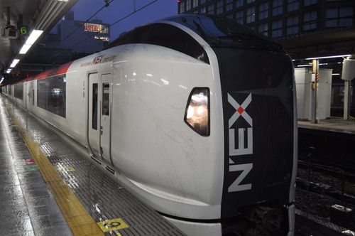 Le NEX appartient au réseau de la compagnie ferroviaire JR East (région Est). Son principal concurrent (car il en a un) est le Skyliner du réseau Keisei (Keisei Electric Railways). JR East utilise une flotte de 22 trains récents puisque ceux-ci sont arrivés sur le réseau à la fin 2009 (photos). Chaque train est composé de quatre voitures motorisées encadrées par deux voitures avec cabine de conduite. Les trains peuvent rouler à une vitesse maximale de 130 km/h. Ils ont une capacité de 290 passagers ( dont 29 en Green, c'est à dire en première classe, ma classe de voyage). Différentes rames partent de différents points autour de Tokyo pour parfois se rassembler et ne plus former qu'un seul convoi comme dans mon cas: Je suis monté à bord du NEX à Shinjuku (gare de départ de la rame de six voitures) pour ensuite faire une courte halte à Shibuya puis à la gare de Tokyo , où nous nous sommes connectés à une autre rame qui venait d'un autre endroit. Cette méthode permet de drainer davantage de clients tout autour de la capitale nippone.