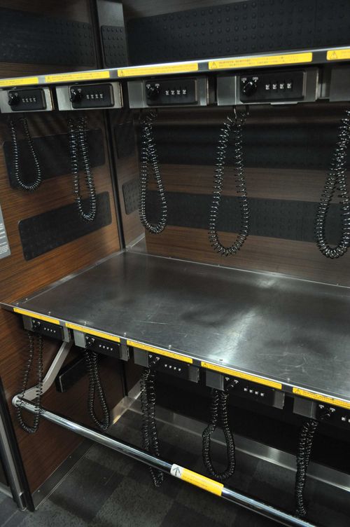 Il me faudra 1h20 pour relier Shinjuku à l'aéroport international de Narita. Sans retard et dans le plus grand confort. Ces trains ne sont accessibles que sur réservation. Il faut donc au préalable acheter un billet auprès d'un guichet. En ce qui me concerne, étant détenteur d'un passeport JR Pass, je me munirai aussi d'un billet avant le départ. Et présenterai les deux documents en cas de contrôle. Le temps est exécrable pour cette dernière journée. Il pleut fort mais je suis à l'abri en attendant sur le quai. Le train est arrivé trente minutes avant car Shinjuku est un départ de ligne. La rame ne sera accessible au public que quinze minutes avant le départ. Le moment venu, j'embarque donc à bord de la voiture Green (première classe). Et dépose mon bagage à l'endroit prévu à cet effet (photo ci-dessous). Ce compartiment à bagages dispose de systèmes anti-vol très pratiques et faciles à utiliser (deuxième photo): Il vous suffit de ranger votre bagage, de passer le câble dont vous extrayez l'extrémité en ouvrant une petite porte (à gauche de la photo en gros plan), à l'intérieur de votre bagage. Veiller ensuite que le bouton se trouve sur la position OPEN et que le compteur à quatre chiffres est bien à zéro. Choisir un code secret à quatre chiffres, entrez le en utilisant le compteur, puis tourner le bouton sur la position LOCK. Votre bagage est désormais protégé pendant toute la durée de votre voyage. Si il vous arrivait d'oublier votre code secret, il vous faudrait attendre la gare terminus du train et contacter le personnel de bord pour pouvoir récupérer votre bien. En revanche, rien de tout cela n'existe sur le train RER B à Paris: Vous ne disposez que de porte-bagages situés au-dessus des sièges ce qui rend impossible le rangement de bagages lourds, sauf à vouloir assommer la personne en-dessous. Vous n'avez plus qu'à entreposer votre bagage à côté de vous, dans l'allée centrale, en gênant le moins possible , et en évitant surtout de les laisser aux portes du train car il arrive que des gangs de voleurs attendent la sonnerie annonçant la fermeture des portes de la rame pour vous subtiliser de force la bagage trop proche de la porte.