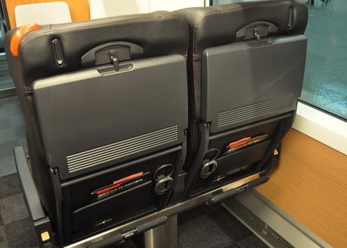 A l'intérieur du train, point de tags, crachats, ou autres détritus sur le sol comme sur certains de nos trains: La cabine première classe est équipé de carrés de moquette gris clair et gris foncé (photo ci-dessous). Les parois du train sont impeccables, ne portent aucune trace de vandalisme et on ne trouve aucune banquette lacérée. Les équipements fonctionnent, les sièges sont inclinables (deuxième photo) et équipés de tablettes et de porte-verres (troisième photo). L'air conditionné offre une température constante et adaptée. La cabine offre aussi une information en continu qui est transmis en quatre langues sur des écrans TV positionnés au-dessus de l'allée centrale. Les rames sont équipées d'un accès internet ( sur abonnement) et une hôtesse passe avec un chariot pour vous proposer boissons, snacks ou autres souvenirs. Le tout payable en liquide ou par carte de paiement. Le voyageur peut ainsi se reposer en toute quiétude sans risque de voir débarquer une bande de vandales pour vous dépouiller de tous vos biens, vous faire une tête au carré ou vous assassiner. Et il existe deux classes de voyage sur le train. Sur notre RER, rien de cela: Il n'existe qu'une seule classe de voyage ( ne sommes-nous pas tous égaux?), les sièges ne s'inclinent pas et sont même parfois lacérés ou décorés de tags (le tag n'était -il pas devenu, pour un certain ministre socialiste de la Culture, le moyen d'expression des jeunes?), l'air conditionné s'obtient en ouvrant les fenêtres (uniquement d'un seul côté) et permet ainsi aux voyageurs de profiter pleinement du temps qu'il fait. Les espaces d'informations sont limités à leur plus simple expression (des autocollants apposés près des portes et des panneaux fixes et inertes représentant le plan de la ligne). L'annonce des stations est réalisée (depuis peu) en anglais et en espagnol, en plus du français bien sûr. Le sol est un revêtement plastique le plus souvent nettoyé à la va-vite, et si vous voyagez le weekend ou en fin de journée, vous trouverez parfois divers détritus à portée de main. Point de caméra vidéo, de contrôleur non plus d'ailleurs (ou si rarement!): Vous êtes livrés à vous -mêmes. Au départ de CDG 1, on vous annonce un train sur une voie et celui-ci se présente sur une autre ( je l'ai vécu jeudi matin à mon arrivée). Dans les gares japonaises, les escalators fonctionnent. A Paris, jeudi matin, à 6h00, aucun escalator n'était en état de marche et des panneaux m'annonçaient que le trafic serait réduit à 4 trains sur 5 pour raison de maintenance d'un certain nombre de rames du RER. Enfin sur les quais des gares japonaises, on trouve des sièges et même un abri chauffé avec des sièges . A CDG 1 , point de sièges et si vous êtes fatigués après un long voyage ou si votre train accuse un retard important, c'est tant pis pour vous.