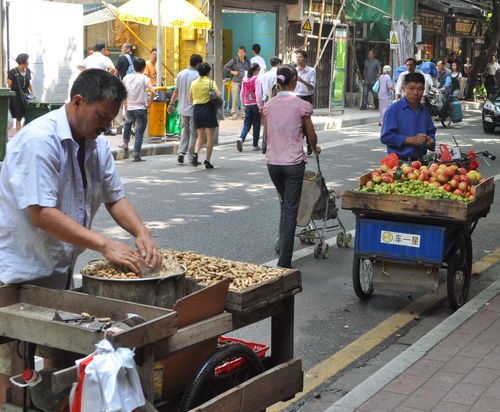 Mon hôtel est situé à la station Yuexiu Park , juste à côté d'une station de métro. L'occasion pour moi d'opter pour ce moyen de transport extrêmement facile à utiliser. Je pénètre dans cette station puis aperçois rapidement des distributeurs de titres de transport (photo ci-dessus). Leur utilisation est très simple puisqu'un menu en anglais est disponible. Il me suffit ensuite de regarder le plan du métro de la ville puis de sélectionner à l'aide du doigt la station où je désire me rendre. L'ordinateur calcule immédiatement le coût du trajet et l'indique sur la partie droite de l'écran. Il ne me reste plus qu'à payer à l'aide de pièces (fente en haut à droite) ou d'un billet (de 5 ou 10 yuans uniquement) en haut à gauche. Je récupère ensuite en bas à droite de la machine, mon jeton vert et ma monnaie. Me voici paré pour mon premier voyage. Lorsque j'atteins les portillons d'accès, je plaque mon jeton sur la borne située dans la partie supérieur du portillon et la porte s'ouvre. Lorsque je ressortirai du métro, il me faudra glisser ce jeton dans une fente située au même endroit. J'ai décidé de me rendre au temple Hualin Si, près de la station de métro Changshou Lu. Il me faut changer rapidement de train mais les correspondances se font aisément puisque les indications sont claires et en anglais aussi. En dix minutes, me voici sur les lieux prêt à me rendre au temple. Malheureusement, je ne parle pas chinois et j'ai pris soin de me faire inscrire le nom de ma destination en chinois sur un petit papier par le concierge de l'hôtel avant de partir. Il me suffira de montrer ce morceau de papier pour que les passants m'orientent à l'aide d'un simple geste. Je serai au temple en dix minutes. Mes premiers pas dans Canton m'offrent des rues ombragées où circulent des vendeurs ambulants (ci-dessous). Les habitants auxquels je m'adresse pour demander mon chemin sont charmants et la barrière de la langue disparaît devant la bonne volonté de chacun. On m'adresse de temps à autre des « Hello » et je réponds en souriant. Je me sens en toute sécurité pendant toute la durée de ma visite. Mais je suis étonné car, contrairement à la France, je ne vois que des Chinois dans les rues: Seulement quelques rares étrangers montrent de temps en temps leur bout de nez.