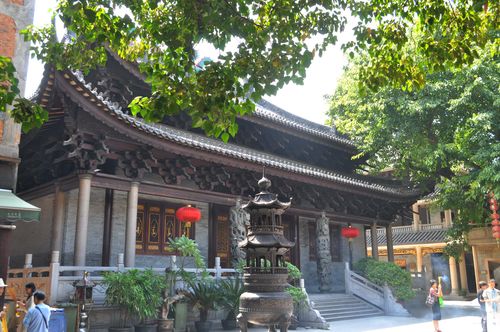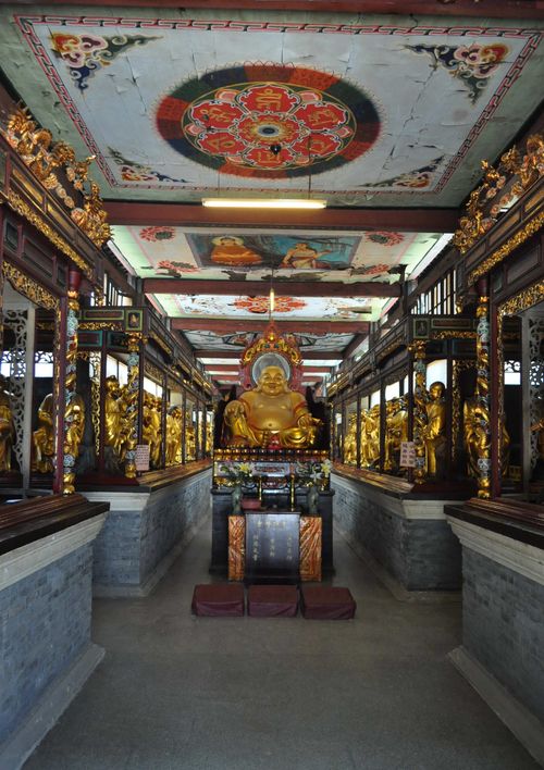 Le temple Hualin Si est accessible librement par une petite entrée ornée de lanternes rouges. De chaque côté du porche se trouve un lion. Dès que j'entre dans le temple, j'aperçois sur ma gauche une boutique et sur ma droite un premier sanctuaire, avec un bouddha doré. On me laissera prendre librement des photos, y compris dans la salle des 500 arhats. Les gens me regardent simplement, un peu surpris par ma présence. Il faut dire que je ne croiserai pas beaucoup de touristes durant cette première journée. Je m'avance vers cette cour qui laisse apparaître le bâtiment principal du temple (ci-dessus), sur ma gauche. Des chinois viennent allumer leurs bâtons d'encens dans un recoin discret avant de se diriger face au temple et d'adresser une courte dévotion en se dirigeant en direction du temple, puis de la tour Sarira, et enfin en direction du Hall des 500 arhats. Des panneaux d'information en anglais me permettent de m'informer sur les lieux. J'apprends ainsi que le temple bouddhiste Hualin Si fut fondé en 526 et reste le temple le plus populaire de la ville. Ce temple connut pourtant des péripéties tout au long de son existence: Une partie fut notamment vendue aux enchères en 1924 pour y construire des maisons.