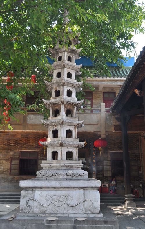 Un autre lieu est remarquable dans le temple Hualin Si. Il s'agit d'une tour en marbre située dans la cour du temple, entre le bâtiment principal et le Hall des 500 arhats, la tour de Sarira. C'est le moine Yuanhai du temple Hualin Si qui construisit cette tour, en 1701 (la 40 ème année de la période Kangqi de la dynastie des Qing), sur l'ordre de l'Empereur Kangxi. Cette tour mesure 7 mètres et est érigée en marbre du rocher des sept étoiles. Elle possède six côtés et sept étages. Chaque pierre est ornée de motifs ce qui permet à la tour d'offrir une allure solide et une structure élégante et classique. En 1924, la tour Sarira demeurera à son emplacement actuel en dépit de la vente d'une partie du temple. Mais en avril 1965, elle sera déplacée (Révolution culturelle oblige!) au Jardin des Orchidées sur la route nord de Jiefang. Et laissera apparaître dans ses fondations 22 sakyamuni sariras qui se trouvaient à l'intérieur d'une crypte (située au centre de la tour). Dans cette crypte se trouvait une boite rectangulaire en pierre, contenant elle-même une boite en bois scellée avec de la colophane (résine transparente) et des reliques bouddhistes. Dans cette boite, on trouva une autre petite boite carrée en bronze avec les mots suivants: »A l'automne de l 'année Xinji (période Kangxi) de la dynastie des Qing, le moine Yuanhai érigea cette tour de marbre pour accueillir les 22 sakyamuni sariras. La postérité les respectera et ne les détruira pas ». Dans la boite en bronze reposait une boite en argent contenant 38 perles et 11 lotus d'argent (le plus gros était un lotus doré entouré de dix autres, plus petits). Chaque lotus contenait une graine. Ce ne fut qu'entre 1994 et 1996 que la tour rejoignit son emplacement initial et que les trésors regagnèrent le temple Hualin Si.