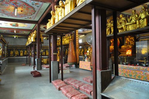 A l'intérieur du Hall se trouve un lieu de prière avec plusieurs sanctuaires (photo ci-dessous). A cet endroit, un panneau nous informe de la présence de Sakyamuni Sarira dans ce temple. Il est nécessaire de revenir sur Sakyamuni qui fut surnommé le sage des Sakyas ou encore le bouddha éveillé. Chef spirituel, il vécut au VI ème siècle avant J.C et est le fondateur historique d'une communauté de moines errants qui sera à l'origine du bouddhisme. Le terme Sarira signifie corps ou corps humain. Dans la philosophie indienne, et plus particulièrement dans le Vedanta (école de philosophie indienne), on dénombre trois corps qui constituent le Jiva (l'individualité). Sarira est apparu après la disparition de Sakyamuni. Sakyamuni Sarira représente ici le très recherché reliquaire bouddhiste, l'un des trésors du monde, dont on dit que toute personne qui l'a vu vivra les trois prochaines années dans la plus grande quiétude et que ses trois prochaines générations deviendront riches. Ces reliques furent déposées au temple en juillet 1996.