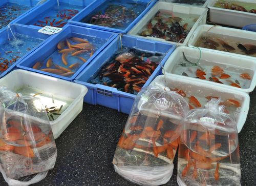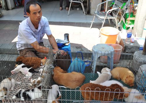 Avant mon départ du temple, j'échange quelques mots en compagnie d'un jeune couple chinois. Nous sommes dimanche et ils ont fait, comme moi, le choix de se promener au temple. Un autre couple vient se greffer dans notre conversation. Je leur fais part de mon souhait de me rendre au marché Qingping et ils me proposent aussitôt de m'y accompagner. Ce marché se trouve derrière l'hôtel Holiday Inn, à dix minutes de marche du temple. Le marché Qingping , situé en face de l'île de Shamian, était autrefois l'un des plus grands et des plus célèbres marchés de Chine mais il a depuis perdu de son animation surtout depuis l'épidémie de SRAS. On y vend en effet des animaux (photos ci-dessous) dont des chiots, oiseaux, poissons, tortues et petits rongeurs. On y trouve toujours la pharmacopée habituelle des chinois avec leurs ingrédients exotiques. Je passe ainsi devant des boutiques qui vendent des poissons et des fruits de mer séchés sensés détenir toutes les vertus. Mais on trouve aussi sur place des fruits et légumes, des souvenirs, des céréales. Ce lieu a conservé un certain exotisme et mérite d'être visité.