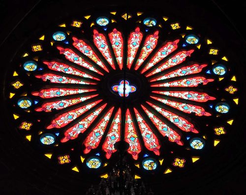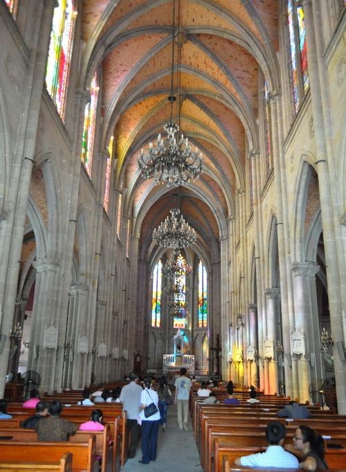 Je pénètre bientôt dans cette cathédrale qu 'on surnomme aussi Maison de pierre (car elle a été construite en granit). J'y trouve des gens assis sur de grands bancs en bois, en train de dormir pour certains ou de lire le journal, d'autres consultent leurs emails sur leur téléphone ou prient. Des tabourets en plastique hideux ainsi que de gros ventilateurs ont été rajoutés ici et là, ce qui donne l'impression d'un joyeux bazar. La Cathédrale du Sacré Coeur fut érigée entre 1863 et 1888 , par Léon Vautrin (Nancy) et grâce au talent du tailleur de pierres chinois, Cai Xiao. Cet édifice , proclamé bien culturel important depuis 1996, offre ainsi un mélange architectural de style chinois et de néogothique. Et témoigne du mariage des cultures chinoise et européenne. L'église a été bâtie sur un terrain qui mesure 2754 m². L'édifice mesure 35 mètres de large pour une profondeur de près de 79 mètres, et une hauteur de 58,5 mètres. Les deux clochers lui donnent une impression de grandeur et l'église, construite en forme de croix, symbolise le sacrifice de Jésus Christ. Les vitraux de la cathédrale racontent des scènes de l'histoire biblique (photo ci-dessous). La Cathédrale du Sacré Coeur est le seul bâtiment gothique qui a été construit à l'aide de pierres taillées , dans toute l'Asie du sud-est. Les outrages du temps firent malheureusement leur oeuvre et il fallut bientôt envisager une réfection complète de l'église. Les poutres en bois avaient été rongées par les fourmis et il fallut les remplacer par des poutrelles d'acier renforcées par du béton dès 1928. En 1938, l'escalier et le sol de la cathédrale furent renforcés avec du béton. En 2000, l'association des Catholiques patriotes de Guangzhou projetèrent une rénovation complète des lieux. En juillet 2002, le maire de la ville décida la restauration de l'édifice pour un montant total de 24 millions de yuans (19 millions furent apportés par la municipalité, trois millions par l'église et deux millions par les dons des fidèles). Les travaux commencèrent deux ans plus tard pour s'achever en octobre 2006. Ils concernèrent les toits, les plafonds, les murs, les vitraux, mais aussi la vérification du mécanisme horloger, l'installation de l'éclairage et d'un système de sécurité, le paratonnerre et l'amélioration de l'acoustique.