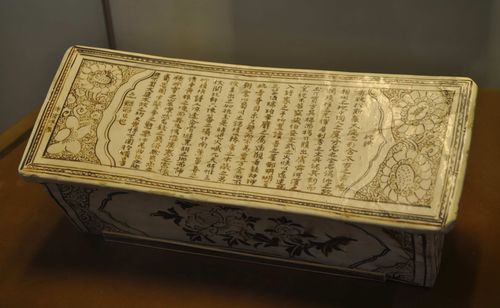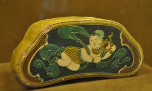 Ces oreillers sont réalisés dans des vernis et des formes différentes. Comme cet oreiller ci-dessus (oreiller marbré de vert datant des dynasties Tang et Song et cuit dans un four du sud de la Chine). Je trouve aussi un oreiller qui porte le texte d'un poème (ci-dessous): Celui-ci date de la dynastie des Song (12è siècle), Cizhou Yao, Hebei. On en voit aussi avec des représentations d'enfants (comme sur cette deuxième photo ci-dessous: Un enfant Sgraffiato est dessiné (dynastie Jin, 12è et 13è siècles, Jinnan, Shanxi). J'en trouverai d'autres, avec des formes d'animaux (le tigre était notamment sensé chasser les fantômes et les lutins et préserver l'endroit de la présence du démon). D'autres oreillers sont des objets funéraires, mais peuvent aussi s'avérer représenter des objets utilisés quotidiennement. Une exposition fort intéressante bien que trop peu documentée, à ne pas manquer si vous passez par là.