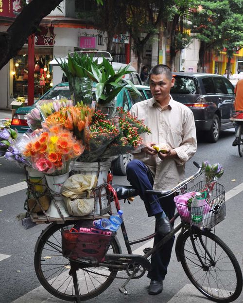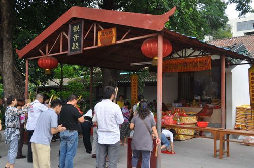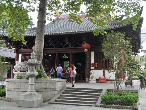 Il existe plusieurs temples à Canton (Guangzhou) mais je choisis de me rendre cette fois au Temple de la Brillante Piété Filiale, appelé aussi Temple GuangXiao Si (temple de lumière et de miséricorde). C'est le plus grand monastère bouddhiste du quartier de Guangdhong. Son influence est considérable et ce lieu est chargé d'histoire. Je descend à la station de métro Xi Me Kou et traverse un quartier très populaire où l 'on croise artisans, petits commerces et marchands ambulants (photo ci-dessous). Nous sommes le 11 octobre mais dans le calendrier chinois, nous sommes le 15, et ce jour-là est un jour faste pour le temple: Beaucoup de visiteurs se sont déplacés et lorsque j'arrive sur les lieux, l'ambiance est presque festive. Plusieurs mendiants font la manche et un moine démarcheur me propose de verser un don pour la réfection des bâtiments.