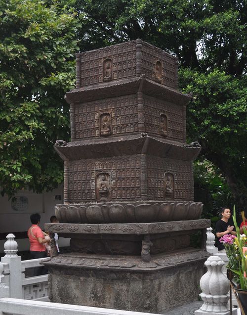Un peu plus loin, je m'arrête quelques instants devant la Pagode en fer de l'Occident (photo). On trouve en effet deux pagodes dans le temple:La Pagode en fer de l'Occident et la Pagode en fer de l'Orient. La première fut coulée en 963 dans les cinq dynasties et est la plus ancienne pagode en fer de la Chine. Carrée, elle était autrefois pourvue de sept étages. Durant la dernière année du règne des Qing, certaines maisons s'effondrèrent sur la Pagode en détruisant quatre étages. Il n'en reste donc plus que trois aujourd'hui. Des images de Bouddha sont sculptées sur toute la surface de cette pagode et on trouve une niche pour la statue de Bouddha au centre de chaque côté. La base de la pagode est entourée par d'énormes pétales de lotus. Les avant-toits ainsi que le piédestal sont gravés avec des apsaras volantes et des gardes célestes.