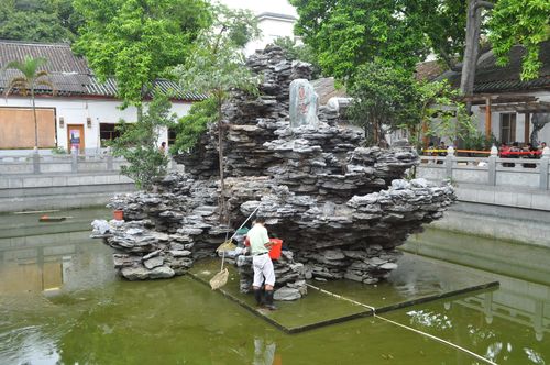 Une petite fontaine (Bowl-washing Spring) (deuxième photo) est située non loin de là, à l'entrée de la deuxième partie du temple, là où ont été rassemblés les bâtiments communs (toilettes, restaurant, bibliothèque...) Un bassin, le bassin du Lotus y figure aussi (troisième photo) mais il a été récemment vidé et des hommes procèdent à son nettoyage. C'est dans cette partie du temple que je dénicherai la Pagode en fer orientale, enfermée dans une grande maison.