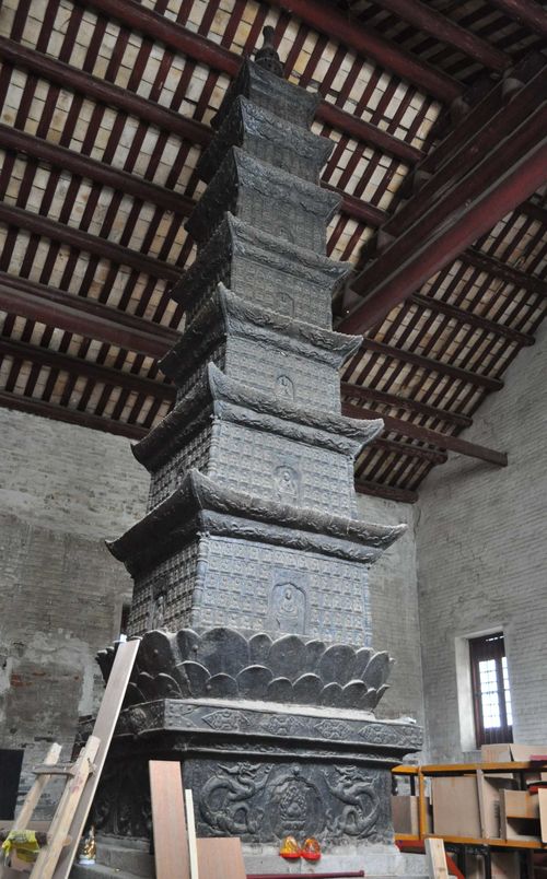 La Pagode en fer Orientale (deuxième photo) est isolée à l'intérieur d'une maison. Peu visible, je l'ai découverte un peu par hasard et grâce à l'aide précieuse d'une guide chinoise qui passait par là. Erigée en 967 dans les cinq dynasties, elle a conservé ses sept étages et mesurait à l'époque 7,69 mètres de haut. Le corps principal de la pagode fait 6,35 mètres. Le clocher de cette pagode a malheureusement été détruit depuis mais on peut toujours admirer l'excellent travail du sculpteur qui créa 900 niches pouvant contenir la statue de Bouddha. Le piédestal Sumeru est, tout comme l'autre pagode, entouré de gros pétales de lotus. Autrefois, la pagode possédait un revêtement doré et était alors surnommée « la pagode aux mille bouddhas dorés ».