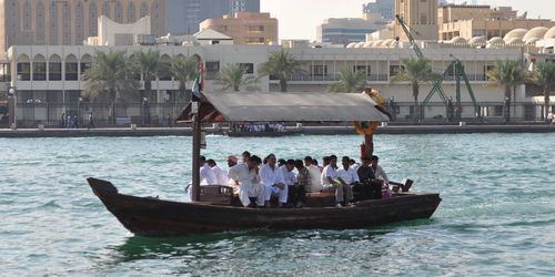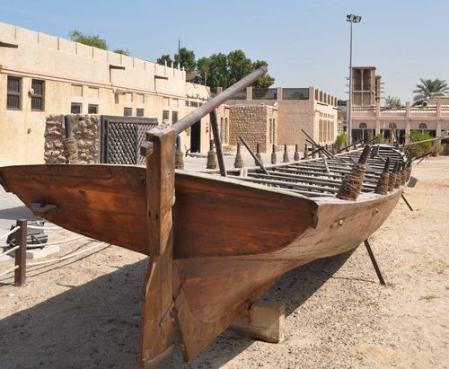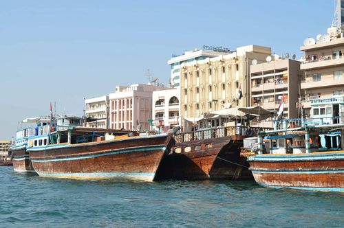 La température reste encore supportable en cette matinée, pourvu qu'on marche à l'ombre. Je croise quelques touristes occidentaux et asiatiques mais je me retrouve souvent seul parmi les habitants locaux qui m'aident gentiment à trouver mon chemin lorsque je les interroge. Je me sens en parfaite sécurité ici. Je ne me trouve pas très loin du port où se rassemblent les bateaux taxis qui vus transportent de Deira à Bur Dubai en quelques minutes, mais aussi les boutres ( appelés aussi dhows), bateaux arabes traditionnels. Ce voilier, originaire de la Mer Rouge est aussi un petit caboteur. Il y en a plusieurs types, servant la plupart du temps au transport de marchandises. Construit en bois, le boutre mesure de 8 à 30 mètres et possède une poupe carrée ou une poupe pointue. La poupe carrée équipe le baggala ( plus gros navire arabe) mais aussi le ganja (70 à 200 tonneaux) qu'on trouve entre l'Arabie et l'Inde, le sambuck (utilisé pour la pêche perlière) et le Jehazi de Zanzibar. On appelle dhows des petits cargos de construction traditionnelle arabe qui font du cabotage en Mer Rouge et dans l'océan Indien. Ils transportent entre 300 et 500 tonnes de charge à coque en bois très élancée.